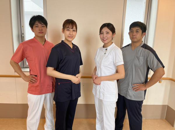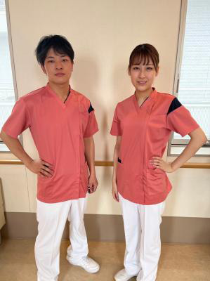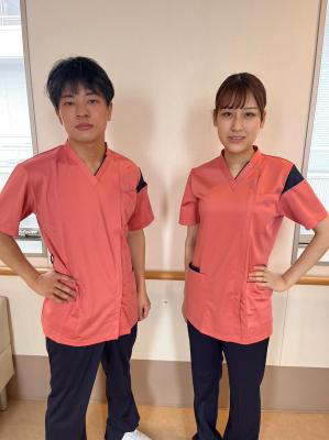 看護部では、令和5年4月からユニフォームが一新され、4色になりました。勤務シフトによって色分けされています。夜勤者はピンク色のユニフォームを着用し、一目で日勤者と夜勤者が区別できます。看護職員同士や他の職種の人も勤務シフトが分かりやすくなりました。